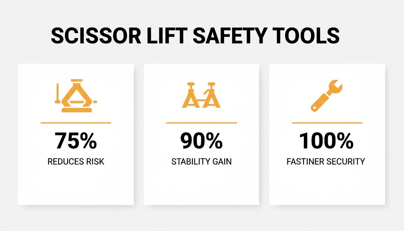 CRITICAL: Always support the scissor lift chassis with certified jack stands before removing any wheels. Never rely on the machine's hydraulics or a floor jack as the sole means of support. Power down the machine and remove the key to prevent accidental movement.