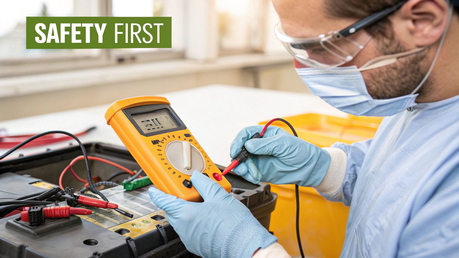 Working on these high-voltage DC systems is no joke. Before your tools touch the machine: Disconnect the main red battery connector completely. Then, use your multimeter to verify 0V across the controller's B+ and B- terminals. The capacitors hold a dangerous charge. Chock the wheels to prevent rolling.