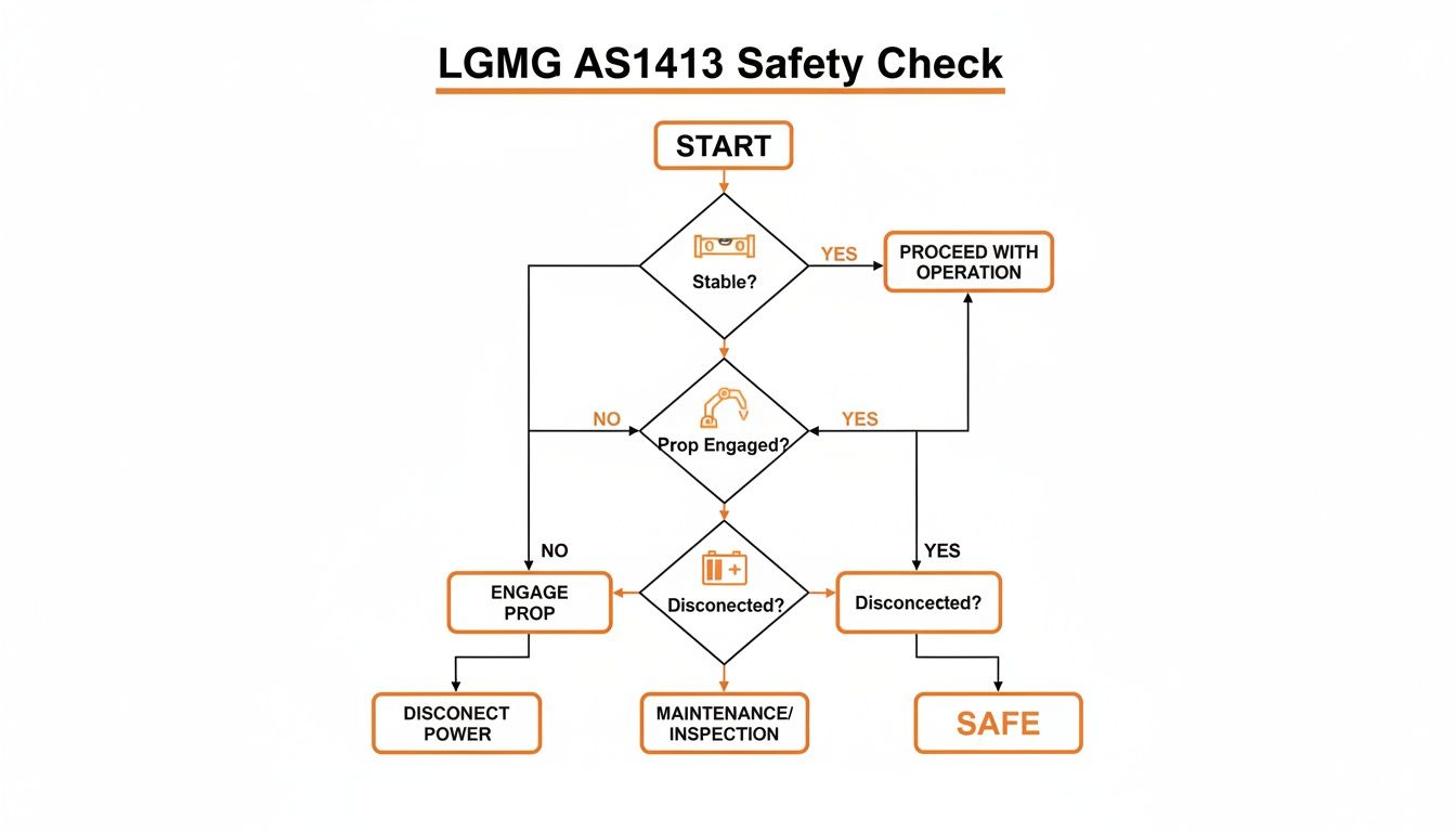 This flowchart isn't a suggestion; it’s the mandatory check to ensure the machine is stable, the safety prop is in, and power is cut before you start.