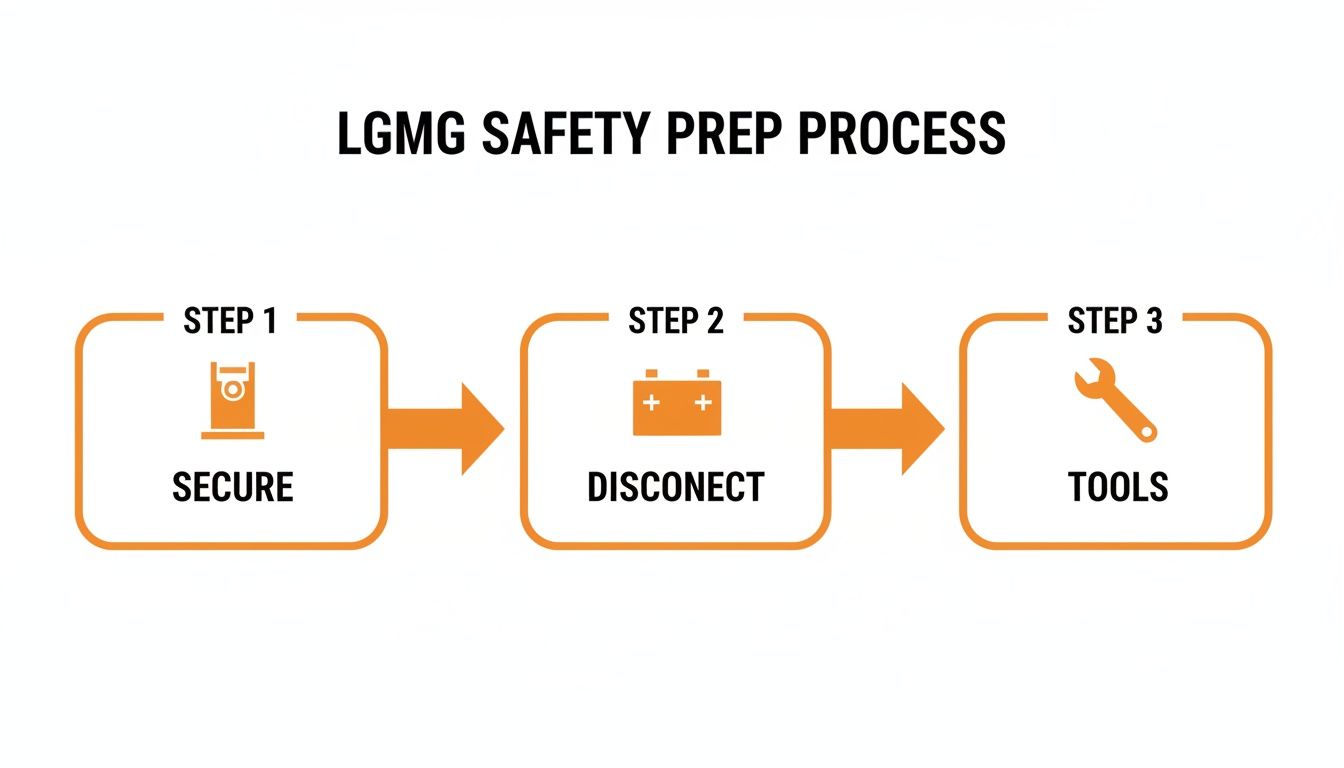 Chock all wheels on a level surface before starting. Slap a "Do Not Operate" tag on the controls. The most critical step is to disconnect the main negative battery terminal before performing any physical checks to prevent accidental power-up or a fried controller. A grounded system is a safe system.
