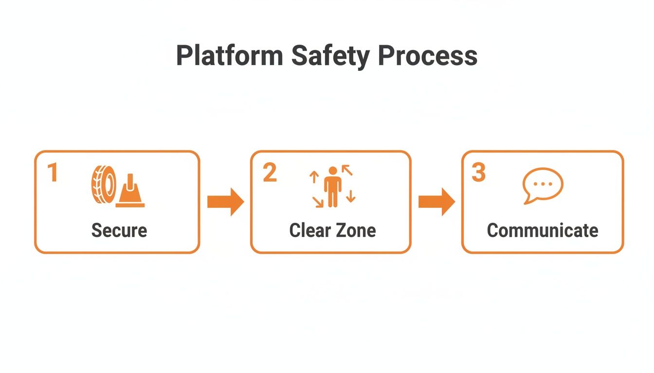 - Establish an Exclusion Zone: Use cones or tape to create a perimeter around the lift. No one walks under that platform. The safe zone should be at least 1.5 times the machine's raised height.