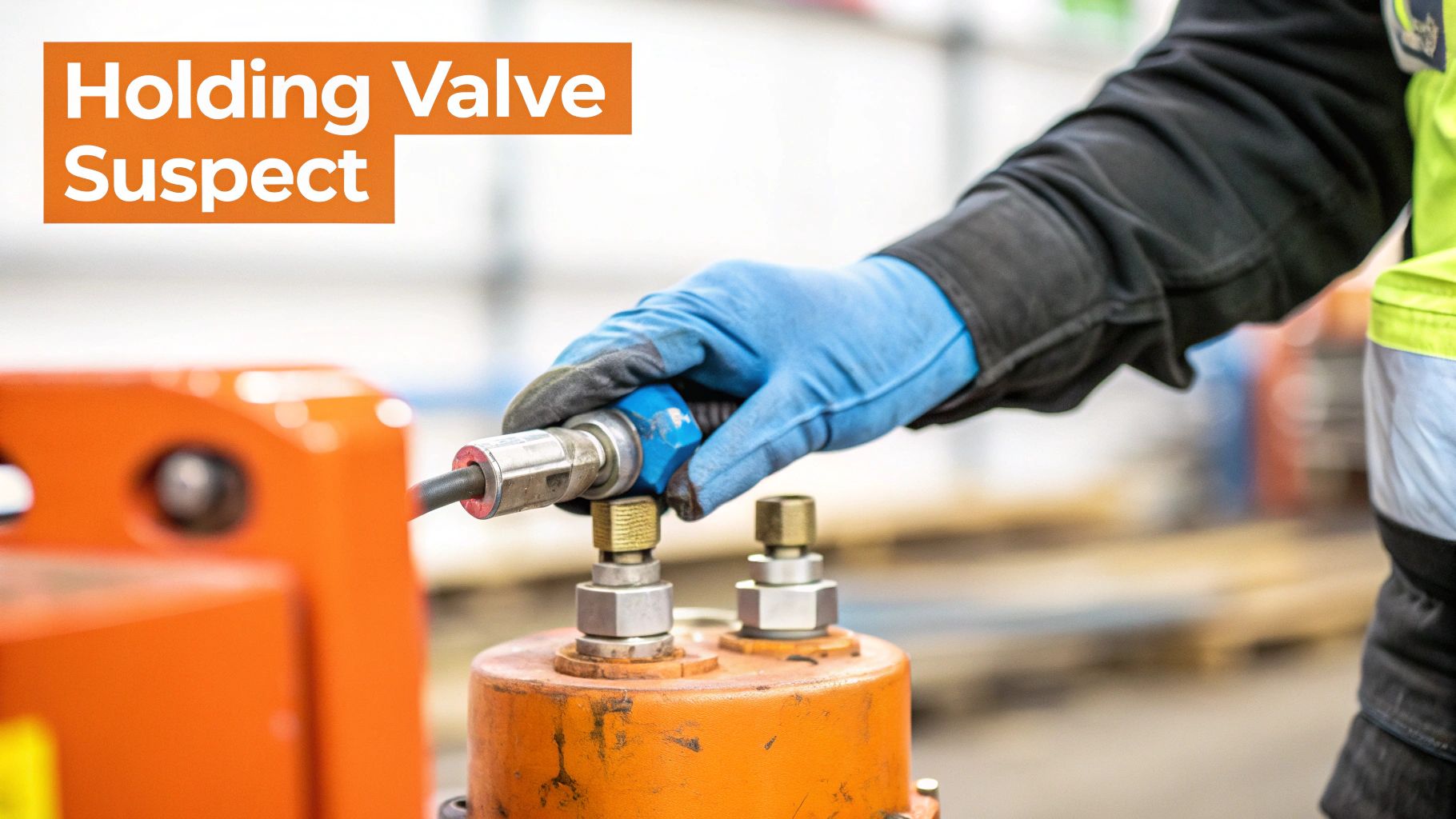 Perform a cylinder leak-down test. With the holding valve ruled out, you must isolate the cylinder. Cap the rod-end port, apply pressure to the base end, and watch for fluid weeping from the capped port. If you see fluid, the piston seal is bad and the cylinder needs to be rebuilt.