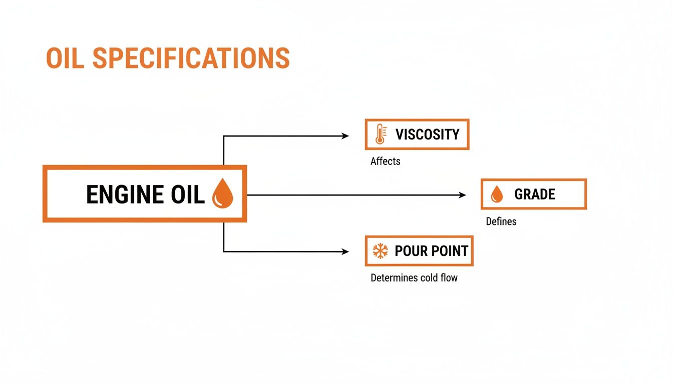 This diagram breaks down the essential oil specs—Grade, Viscosity, and Pour Point—that you absolutely must get right for cold weather performance.